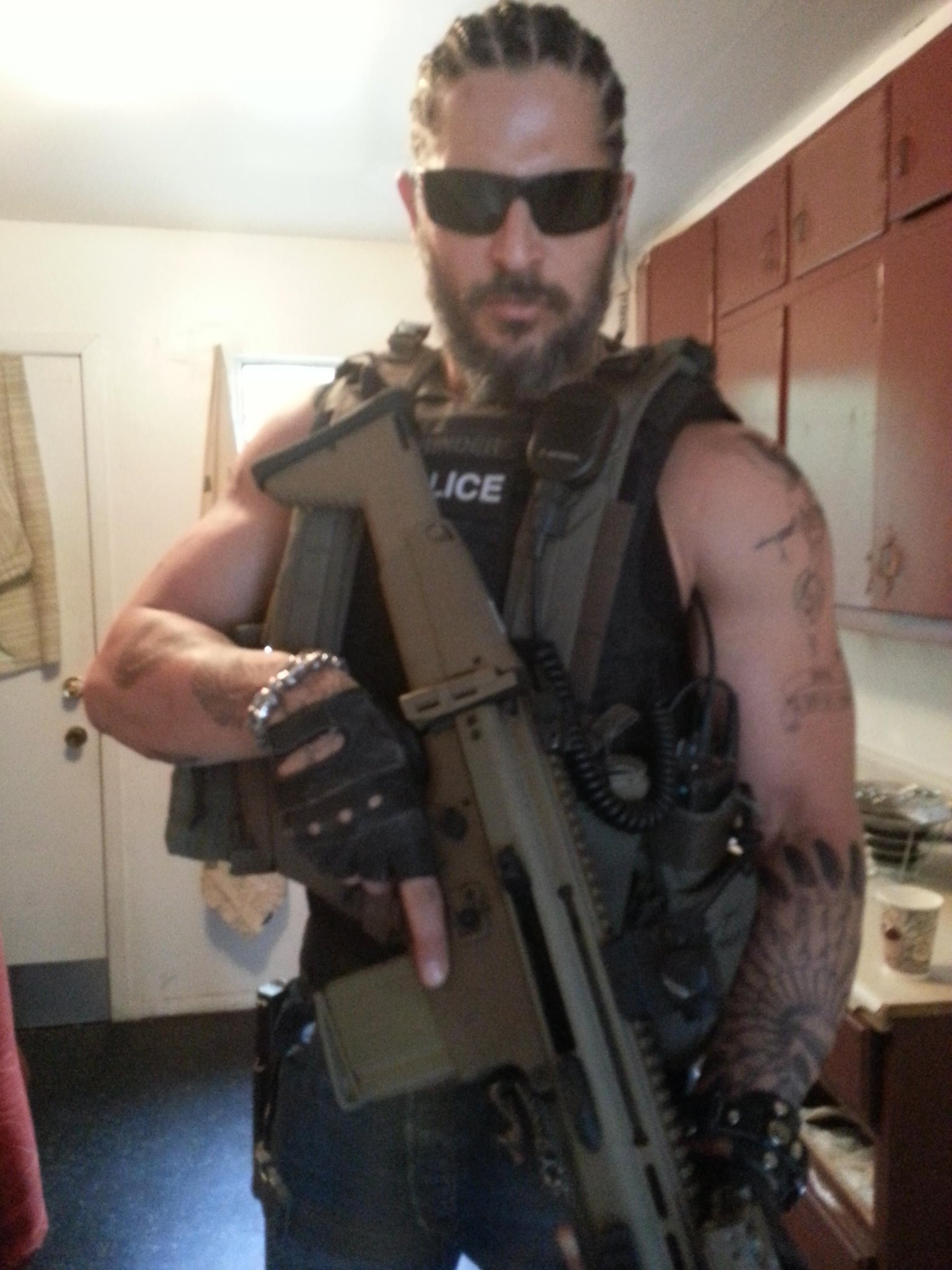 In the film, he plays Grinder, a member of a task force the DEA has put together to fight against the Mexican cartels. “I’ve spent the past four months training with guys who do it for a living. That’s complete with ridealongs with narcotics officers in South Central, where, like, I saw some stuff go down. I’ve been training with a task force that goes around the world training SWAT teams how to sweep buildings, which is amazing. I’ve been out on the shooting range firing fully automatic weapons with the sheriff’s department. I’ve trained MMA stand-up and ground fighting, which is stuff that I’ve done before,” he says. “My character’s deep undercover within a biker gang. I got to design my own biker cut. I helped design the tattoos that I’m covered in. My character’s part Native American, so there’s a skull in a headdress on one arm. He was also a former Marine, so there’s a couple different takes on that. Basically, his job is to rid the planet of souls that shouldn’t be here. So the tattoos are death-themed. I’ve got a rattle snake skeleton on one forearm.”
