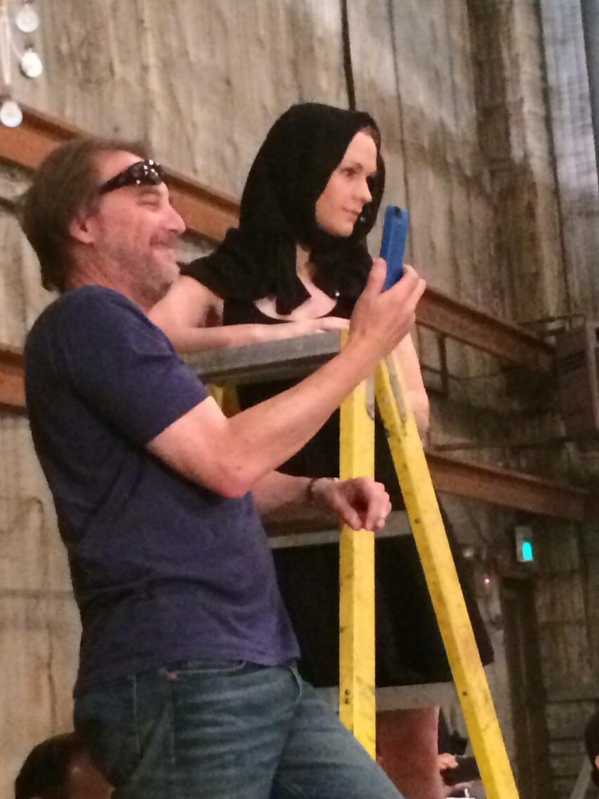 On set w @gdfearless with a good view of fx blood explosion test. Hair protection provided by my black cardigan. What scene could this be for????
